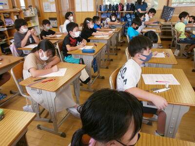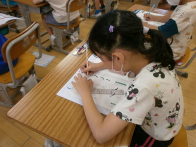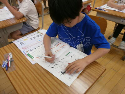 2年1組では、書写の学習で左はらいの方向の違いを学習していました。たしかによく見ると、長さの違いだけでなく、微妙な方向の違いが分かります。方向に気をつけると、文字が整います。