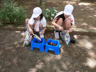 今まで小さなポットで育てていた3年生のほうせんかも、いよいよ鉢への植え替えをしました。担当の先生の話をよく聞き、新しい土を入れながら植え替えをしましたので、これからどんどん大きくなりますね。毎日、観察をしている子も多く見られます。花が咲くのが楽しみですね。
