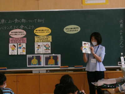 今日は、善郷小の栄養教諭をお迎えし、4年生の食の指導を行っていただきました。今日のテーマは「栄養」。食べ物は大きく赤(血や肉になる)黄(熱や力のもととなる)緑(体の調子を整える)ものに分かれます。4年生は、今日の給食のメニューをこの3つに分ける学習をしました。