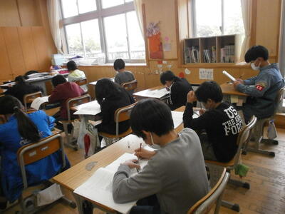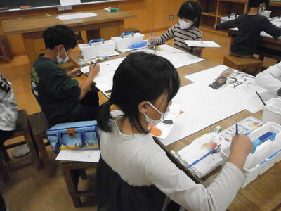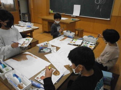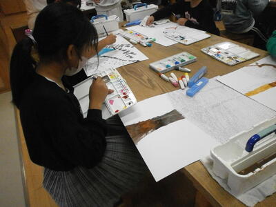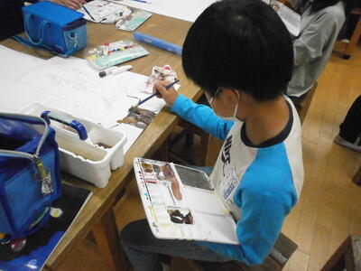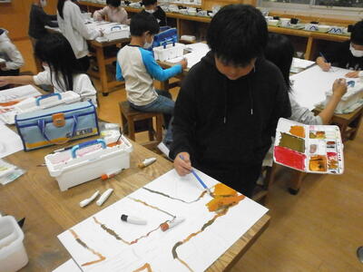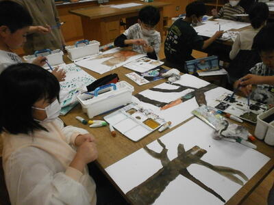 4年生では、木から感じたことや思いついたことを絵に表していました。様々な色を使って、木の質感を出す工夫をしていました。子どもらしい独創的な絵が仕上がりそうです。