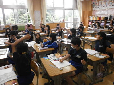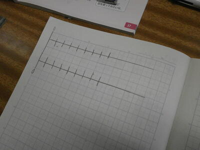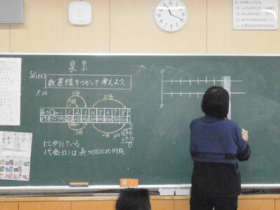 5年生が数直線を使って比例の関係を考えていました。数直線は、算数において、強力な味方になります。比例はもちろん、割合など2数の関係を考えるときに力を発揮します。まずは、線を引き、もとになる数を記入していきましょう。ぜひ、数直線名人になれるようがんばってください。
