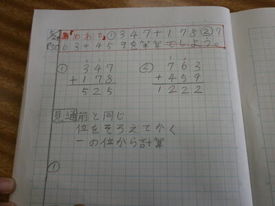 3年生は、3けた+3けたのたし算の学習をしていました。位をそろえることがポイントとなりますが、桁数が増えると少し悩んでしまうようです。みんなで話し合いながら解決方法を見つけていました。集団で学ぶっていいですね。