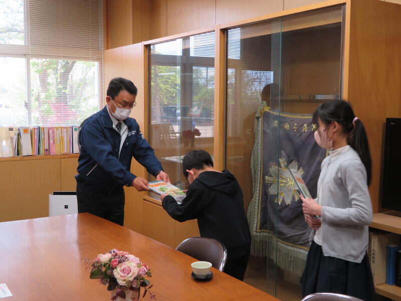 4月27日に、矢吹町文化財保護研究会の皆様においでいただき、『矢吹町の歴史』Ⅰの贈呈式を行いました。この資料は、子ども議会で出された「矢吹の歴史を知る本がほしい」との要望を形にしたものとお聞きしました。矢吹町の古代・縄文・弥生・古墳時代の様子をまとめた資料となっており、矢吹を知る上で貴重な資料だと思いました。