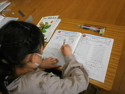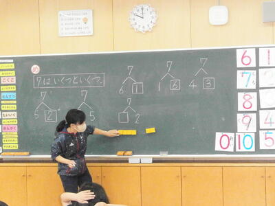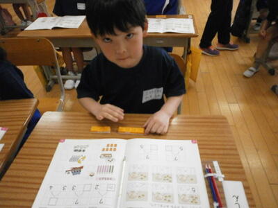 1年生が算数の勉強をしていました。今日は、7がいくつといくつに分かれるかをブロックを使って学習していました。みんな先生の話をよく聞いて、ブロックを動かしたり分かったことをノートに書いたりしていました。立派な授業態度はですね。
