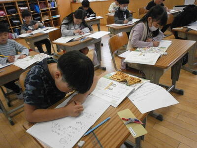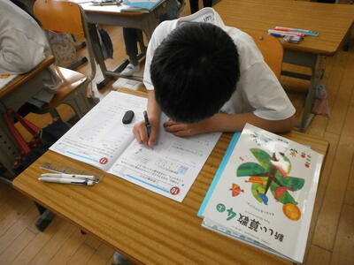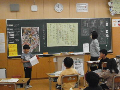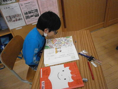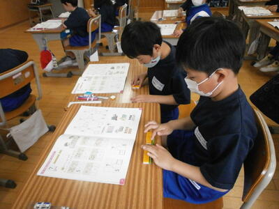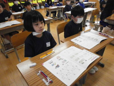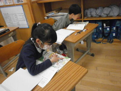 2年生では、教科書の絵の中から一人に焦点をあてて説明する『ともだちをさがそう』の学習をしていました。説明を聞いて友だちを探すのですが、大事なことを落とさずに聞くことがポイントのようです。聞き取ったことをメモしている子どももいました。