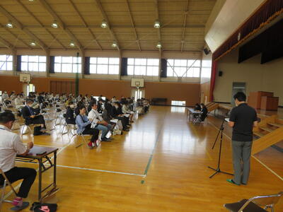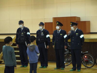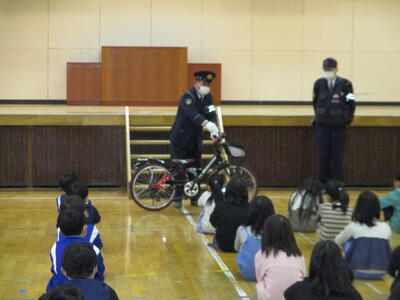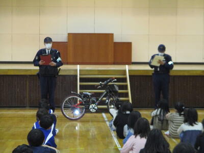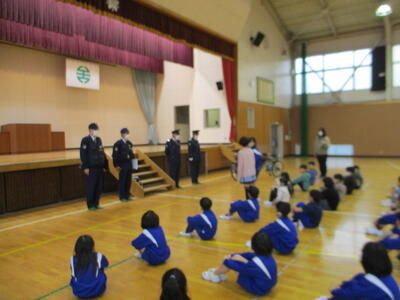 今日は、3・4年生を対象とした交通教室を行いました。あいにくの雨のため、予定されていた校庭での自転車実習を行うことはできませんでしたが、交通教育専門員様からは、自転車整備の合い言葉「ぶたはしゃべる」(3~5年生は分かるはずです)や手信号についてをご指導いただき、警察署員様からは、自転車に乗る時には、大人も子どももヘルメットが義務になっていることなどをご指導いただきました。