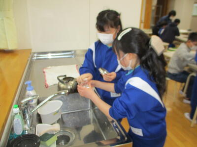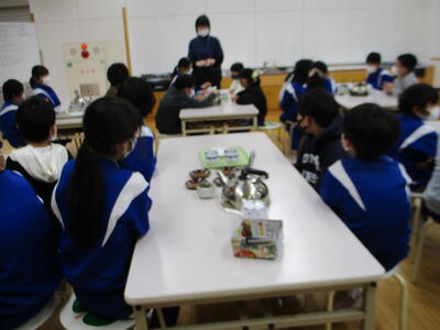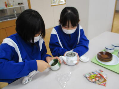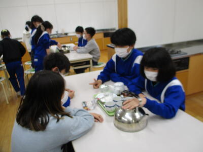 調理室をのぞいてみると、お茶のいい香りが…。5年生が、班で協力しながらお茶をいれていました。計量スプーンでお茶を量り、計量カップで水の量も量っていました。こんなに丁寧にお茶をいれるのは初めてだそうです。いい経験ですね。