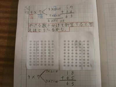 3年生は算数の学習をしていました。9×7=9×3と9×4をたした数であるという勉強をしました。かけられる数の見方が大事ですが、みんなで考えを出し合い、答えを導き出す姿は素晴らしいです。ふり返り問題にも取り組み、「できてうれしかったです」という声が多く聞かれました