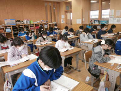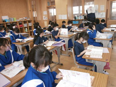 3年生は、国語の学習で『きつつきの商売』を読んでいました。今日は、1の場面と2の場面はどちらが好きかを理由もあわせて発表する姿が見られました。一人一人、好きな理由もきちんと答えられる3年生がたくさんいました。すごいですね!!感心しました。