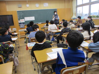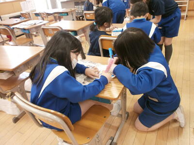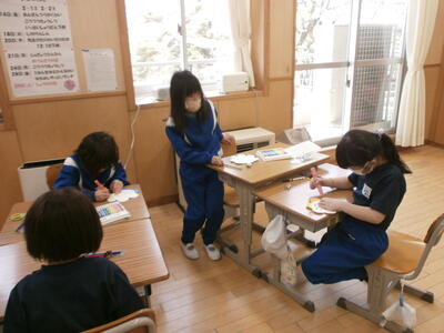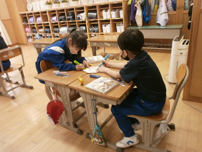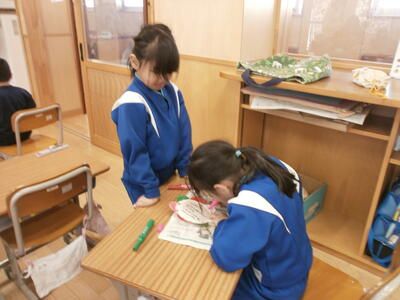 2年1組・2組教室では、1年生へのプレゼントを作っていました。1年生を迎える会のための準備です。心をこめたメッセージや配色にも気を配り、1年生のために作っている姿を見て、成長を感じる時間でした。