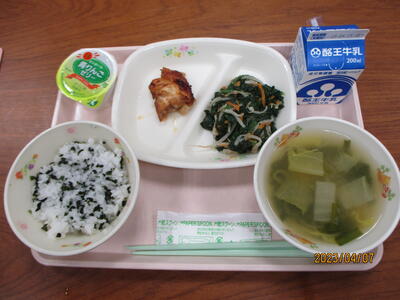 今日のメニューは、牛乳、わかめごはん、鶏肉の朝鮮焼き、にらのおみそ汁、三色ごまあえ、デザートにゼリーがついた献立でした。温かい給食が食べられるのは自校給食のよさです。作っていただいている調理員さんに感謝ですね。