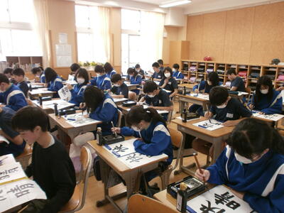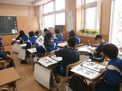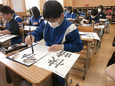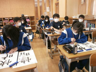 6年生が書写の授業で毛筆を使った学習をしていました。今日は点画のつながりを考えて文字を書くことがねらいでしたが、先生の指示に従い、静かに毛筆に向き合っている姿はさすが6年生です。凛とした空気の中、墨のにおいの中で集中した時間が流れていました。