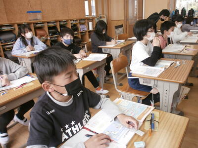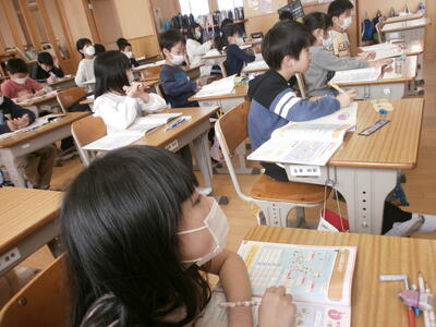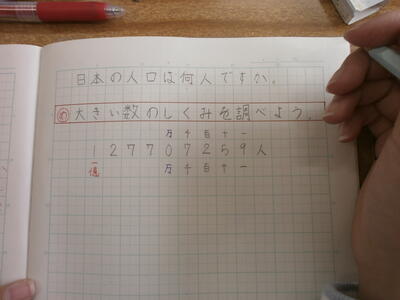 4年生の算数の授業では、一億の位を学習していました。日本の人口を例に一億以上の数の読み方を確認していましたが、一億は果たしてどのぐらいの大きさなのか…矢小の4年生の約3,333,333倍の数です。ん?分かりづらいですね。でも、大きい数には間違いありません。真剣な眼差しで先生の話を聞く4年生。素晴らしいですね