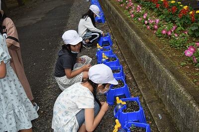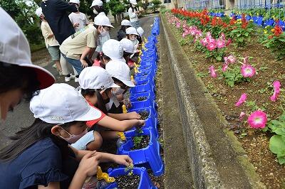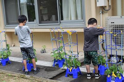 6月23日(木)の朝、2年生がミニトマトの苗に何かをしていました。近寄ってみると、白く丸いものを鉢に入れていました。それは肥料でした。「大きくなってね」という願いを込めて、肥料をあげていましたよ。