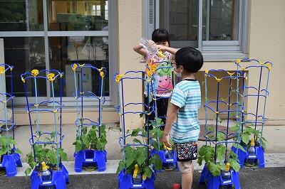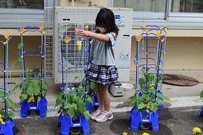 1年生のアサガオが大きく育ってきました。中には、支柱を越えてツルを伸ばしているアサガオも見られます。1年生の子どもたちは、水やりを欠かさず行っています。