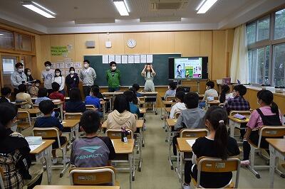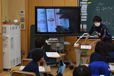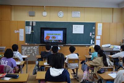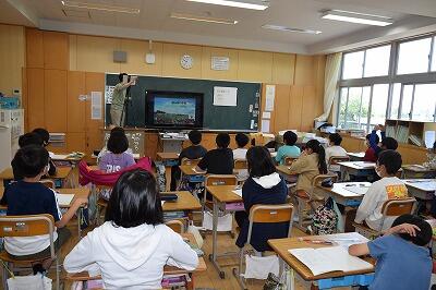 5月27日(金)は、「田んぼの学校」の田植えの予定でしたが、雨のため中止になりました。そこで、東京農大の先生や学生、役場の担当の皆さんが学校を訪問しました。5年生を対象に、お米の授業をしていただきました。