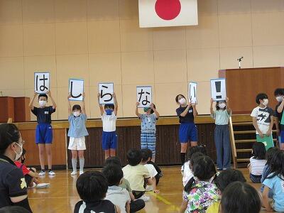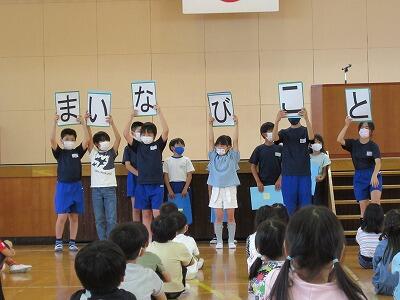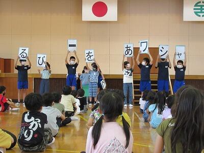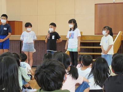 5月25日(水)にプール開きを行いました。体育委員会から、『走らない』『飛び込まない』『シャワーをあびる』などのプール使用の諸注意をクイズ形式で行いました。各学年の代表児童からは、『25mを泳げるようになりたい』『顔をつけられるようになりたい』などの目標が発表されました。安全に気をつけて、プール学習を楽しみましょう。