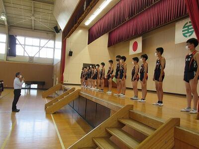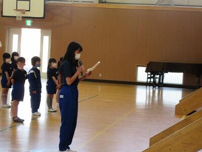 5月30日(月)に、陸上選手壮行会を行いました。これは、6月4日(土)に開かれる全国小学校陸上交流大会県南予選会の選手を励ます会です。今年度は、5,6年生15名が出場します。6年生の吹奏楽部長から、「これまでの練習の成果を生かして、がんばってください。」と選手に励ましの言葉が贈られました。陸上部長からは、壮行会のお礼と大会への決意が述べられました。選手の皆さん、自己ベストを目指してがんばってください。