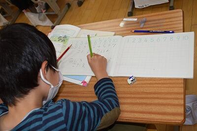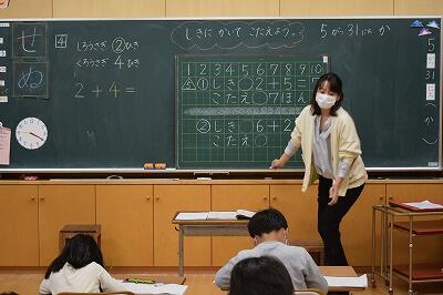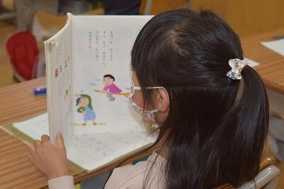 1年生教室では、1組が算数科、2組が国語科の学習をしていました。1組の算数科では、「式に書いて答えよう」の学習でした。ノートも丁寧に書けていました。2組の国語科では、「おばさんとおばあさん」の音読の学習をしていました。みんな上手に読めていました。