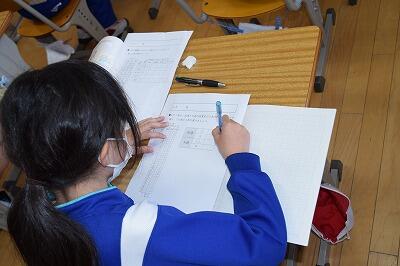 4年生は、算数科の学習で「グラフや表を使って考えよう」の学習をしていました。子どもたちは、表から読み取る方法を学び、分かったことを友だちと話し合っていました。4年生も対話を取り入れた学習が進められていました。
