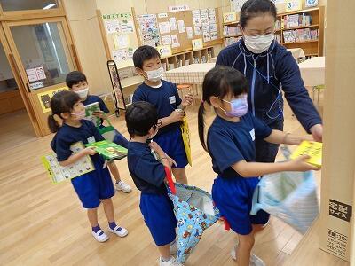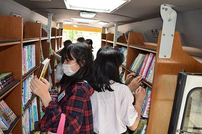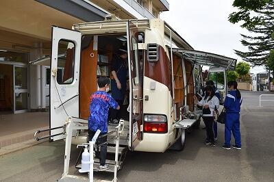 5月11日(水)の昼休みに、矢吹町移動図書館の「よむよむ」が来ました。子どもたちは、図書カードと手提げ袋を手に、思い思いに本を選んでいました。今回は、一人最高2冊までの貸出しでした。
