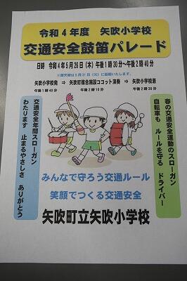 2022年5月16日 16時59分5月26日(木)に矢吹町立矢吹小学校交通安全鼓笛パレードを行います。今年度は、矢吹小学校~複合施設ココットの往復で演奏します。PRのためのポスターを作成しましたので、内容をご確認ください。なお、ポスターは、学区内の商店や銀行、飲食店、園などに掲示していります。コロナ感染防止対策をしてご覧ください。
