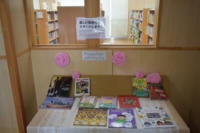 本校の図書館脇廊下には、図書コーナーを設置しています。年度初めということで、今月のテーマは「学校」です。子どもたちに楽しんで読んでもらいたいです。また、各階段には、額に入れた児童の絵画を展示しています。1年間で、全児童の作品を展示しています。