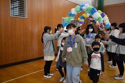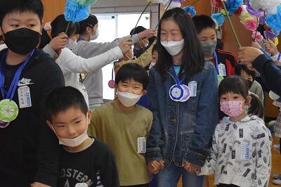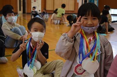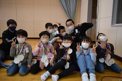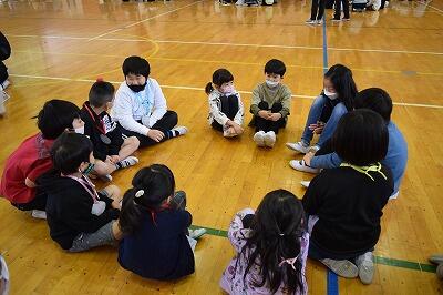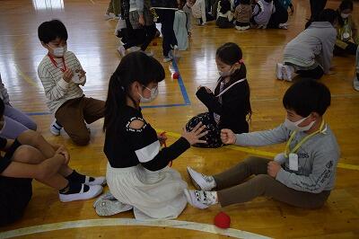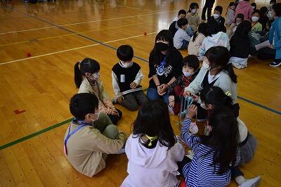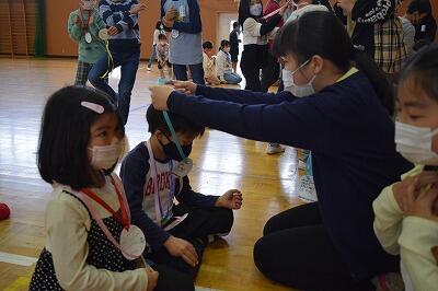 会が始まりました。初めに、6年生の代表から、「ご入学おめでとうございます。この会を楽しんでください。」と歓迎の言葉が述べられました。次に自己紹介です。班ごとに輪になって、名前などを紹介していきましていきました。次に1年生と上級生のじゃんけんです。1年生が勝つまでじゃんけんをし、1年生が勝ったらメダルのプレゼントをします。たくさんのプレゼントに、1年生は大喜びです。