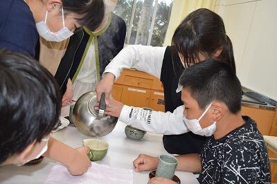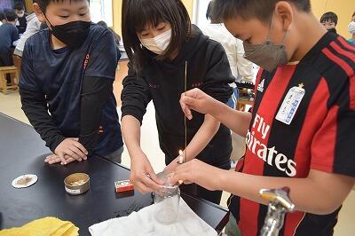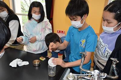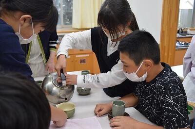 4月28日(金)、こんな学習の姿が見られました。まずは5年生です。家庭科の学習で、お湯を沸かし、お茶を入れる学習をしていました。沸騰したお湯を、容器に移し、80度ぐらいに冷ましてから急須に注ぎます。やけどに注意しながら上手にできました。また、6年生は、ものの燃え方の学習です。チッ素、酸素、二酸化炭素の中でものを燃やす働きがある気体は何かを調べる実験です。チッ素を集気瓶に入れて、ろうそくの火を集気瓶に入れると、あっという間に火は消えてしまいました。どんなことが分かったかな?