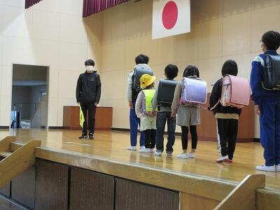 5月9日(月)の全校集会で、登校班による道路横断の仕方について、全校児童で考えました。「班長が安全を確認して道路中央で横断旗を上げる→副班長が先頭に出て、道路を横断する→横断が終わったら、班長に続いて全員がお礼のあいさつをする」というのが良いということになりました。明日から,子どもたちが実践することと思います。