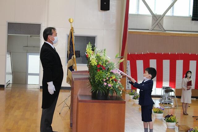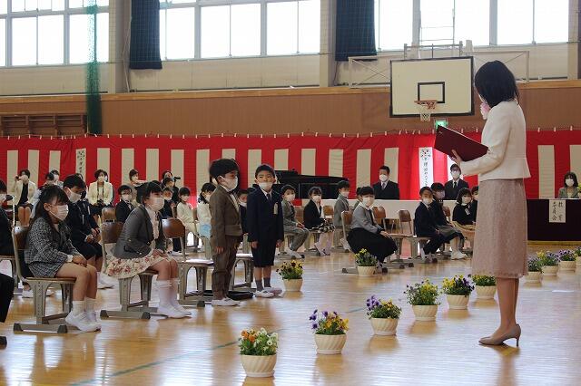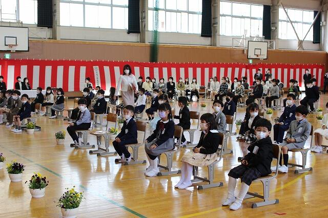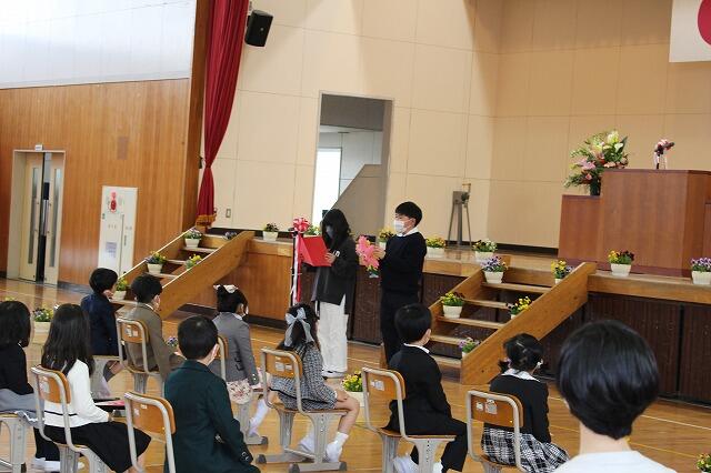 入学式が始まりました。担任の先生を先頭に、新入生が元気に入場してきました。6年生も拍手をしながら、歓迎の笑顔でいっぱいです。次に、担任が入学児童呼名を行いました。名前を呼ばれた新入生は、大きな声で返事をして立ちました。それから式辞を行いました。内容は、「皆さんが小学校で楽しく生活するために4つのお約束をお話しします。一つは『じょうぶな子どもになること』、二つは『自分の良いところを見つけること』、三つは『矢吹小学校や矢吹町のことが好きになること』、4つは『お勉強を頑張ること』ということでした。また、6年生代表の吉田梨乃さん、角田龍さんからの歓迎の言葉には、上級生からの優しいメッセージが込められていました。