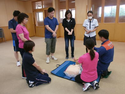 7月22日(月),矢吹消防署の署員さんをお招きして,「心肺蘇生法及びAED操作講習会」を開催しました。講師を務めていただいた署員さんは次の3名です。