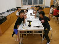 一つ目は「紙ヒコーキによる人物あてゲーム」です。グループごとに色分けされた用紙に自分の好きなことなどを英語もしくは日本語で記入し,紙ヒコーキを作成します。教室の両端にグループごと別れ,相手に向かって互いに紙ヒコーキを飛ばします。対面のグループより飛ばされた紙ヒコーキを拾い,グループ内で話し合ってそこに書かれた内容から誰が投げたものか予想するゲームでした。