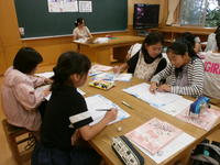 三つ目は「手さげバッグへのペイント」です。手さげバッグにペンや絵の具などでアメリカ調のロゴや短い英文などを書き,オリジナルバッグを作成しました。