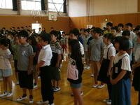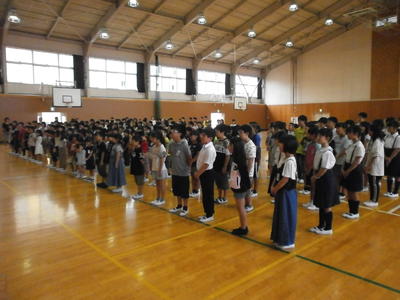 本日から令和元年度第2学期がスタートしました。大きなけがや病気もなく,みんな楽しく夏休みを過ごすことができたようです。そして体育館に全校生が一堂にそろい,始業式が行われました。まずは校長先生のお話です。校長先生は,けがや病気もなく,元気に登校してきたことに対し,称賛の言葉を送りました。そして,学校宛に暑中見舞いを送ってくれた,2年生のハガキの中身を紹介しました。続いて,校長先生は2学期のめあてについて話しました。一つ目は,「できるようになりたい」ことを一つ決めて,できるようになるまでがんばってほしいということです。二つ目は,あいさつや返事ができるように,また尋ねられたことにしっかり反応できるようになってほしいということでした。最後に,努力して実りある2学期に,そして,自分や友達のがんばりに感動できる2学期にしてほしいというお話で締めくくりました。一人一人が,めあてをしっかりもってがんばる2学期にしてほしいものです。