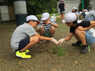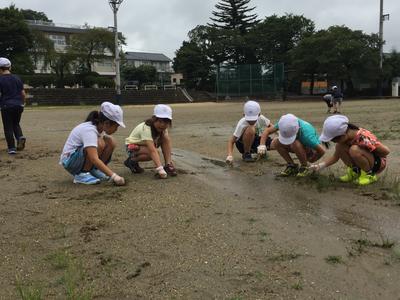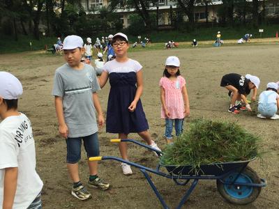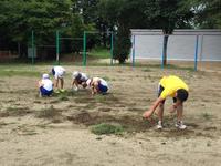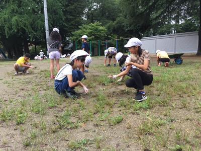 7月20日(土)のPTA環境整備では,お忙しい中,また朝早くから校庭の除草活動を行っていただきありがとうございました。校庭はすっかりきれいになりました。ところが7月後半からの猛暑でどんどん草が生い茂ってしまいました。そこで8月21日(水),全校生によるクリーン作戦(校庭と花壇の除草作業)が行われました。暑さをしのぎやすい朝のうちに行う予定でしたが,開始前から雨が降り出したため,2時間目終了後の休み時間に行うことになりました。5年生が花壇,1・2・3・4・6年生が校庭を担当しました。朝のうちに降った雨のおかげで土が柔らかくなっていたため,草はとても抜けやすくなっていました。みんな集中して,10分間の除草作業に取り組みました。最後に抜いた草を環境ボランティア委員会のみんなが回収して,この日の活動は終了。しかし,校庭を見渡してみるとまだまだ残された草は多く,引き続き明日の第2回でがんばらなくてはなりません。ちなみに,3年生と4年生は2時間目にプールに入っていたので,この時間には実施できず,昼休みに行いました。責任感の強さが感じられる取組は立派です。また明日もがんばりましょう。