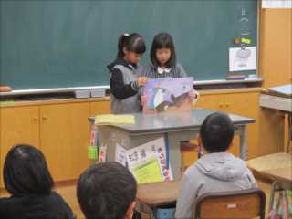 読書週間に入り、読書活動の充実を目指して、児童会図書委員会の子ども達が、「読書スタンプラリー」などの様々な取り組みを行っています。今回は、図書委員の子ども達が、朝の読書タイムの時間に、1・2・3年生の教室を訪れて行っている「読み聞かせ」の様子を紹介します。