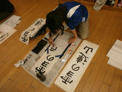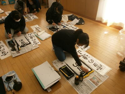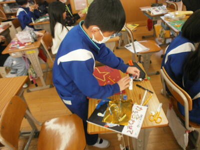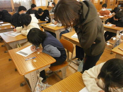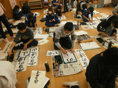 6年間の集大成。小学校最後の書き初めです。とめはねはらい、しんにょうなどのテクニックは必要ですが、バランスの取り方がやはり難しいです。しかし、子どもたちは手本を見ながら、素敵な作品を作っていきます。さすが、6年生です。
