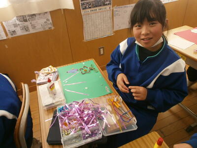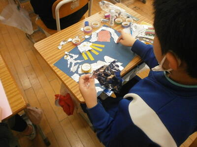 自分で準備した物、学校で準備した物…たくさんのキラキラを紙の上で表現します。テープもあればアルミホイルもあり、石のような物もあり、それぞれのキラキラワールドを作っていました。自然と子どもたちの顔もキラキラしていました。