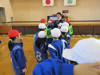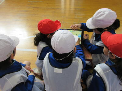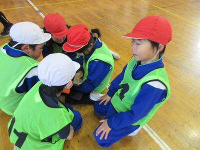 3年生は、体育の時間に、ゴール型ゲーム「ポートボール」の学習をしています。ボールの扱い方も大事ですが、チームで協力してゲームを進める作戦も大事です。