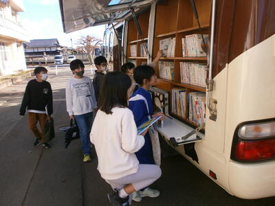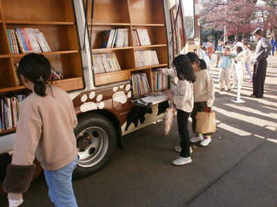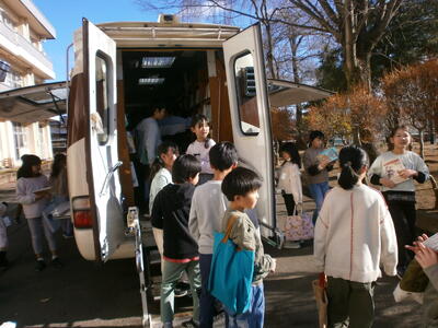 今日は、今年最後の移動図書館「よむよむ号」の来校日でした。子どもたちは、それぞれ興味のある本を借りていました。