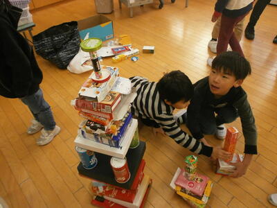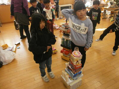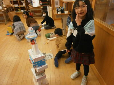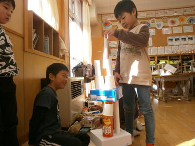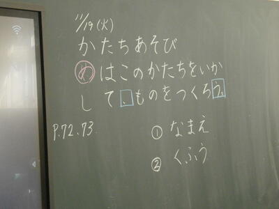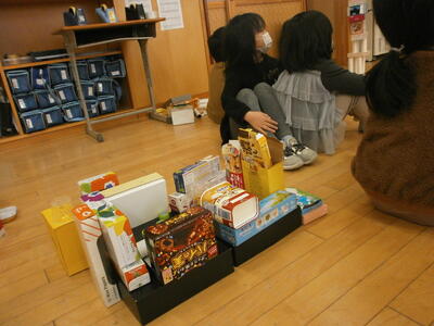 1年1組で、算数の学習で、たくさんの箱を使用しながらかたちあそびをしていました。(おうちから持ってきたとのこと。ご協力ありがとうございました。)