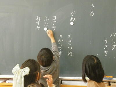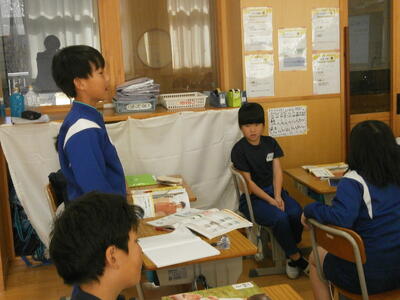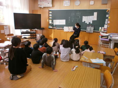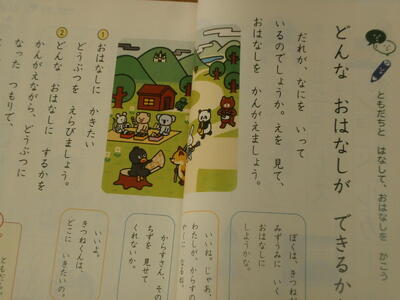 1年2組では、国語の授業で、ペアになってお話を考える学習をしていました。