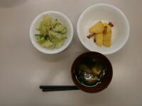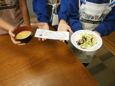 今日は、6年生の調理実習だったとのこと。栄養のバランスを考えた献立で調理したそうです。校長室に運ばれてきたのは、キャベツの塩昆布あえとえのきとたまごのみそ汁でした。なかなか美味しかったですよ。ごちそうさまでした。