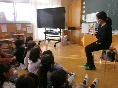 読み聞かせボランティアの皆さんのお話を見る子どもたちの目がいいですね。