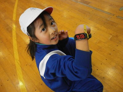 体育館では、腕時計!?を付けた2年生がいました。これは、子どもたちの心拍数や運動量を計るために付けているとのことでした。目標を設定する意味でも効果があるようです。