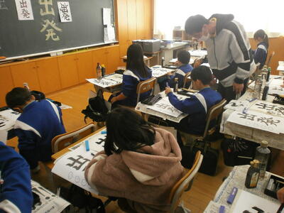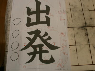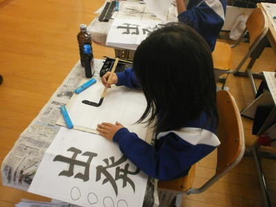 4年生が、書写の学習で、「出発」という文字を毛筆で書いていました。