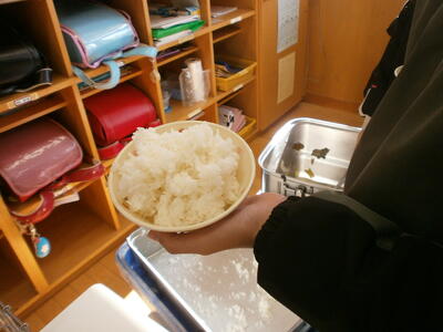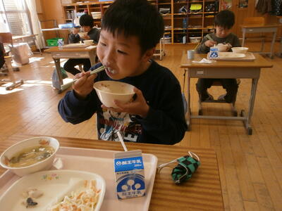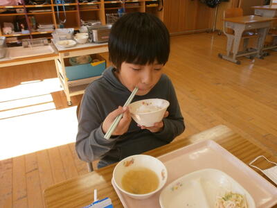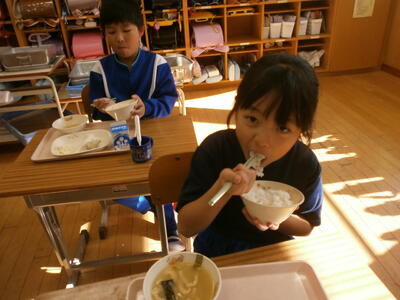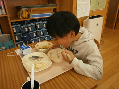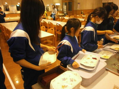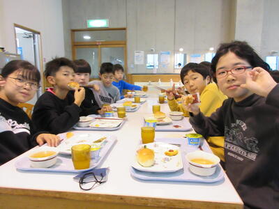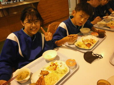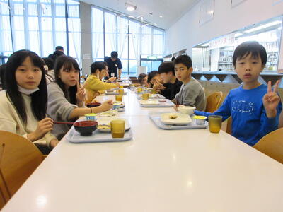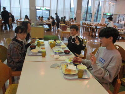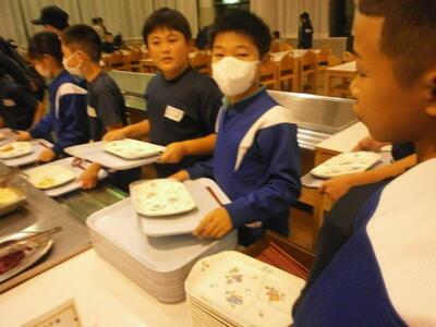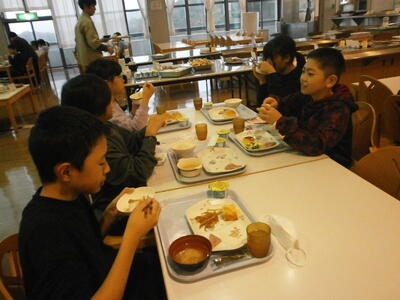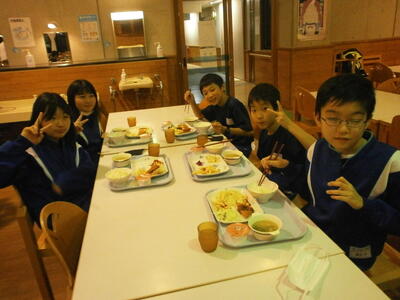 宿泊学習2日目。昨日の疲れが残っている顔ですが、元気に朝食をいたただきました。