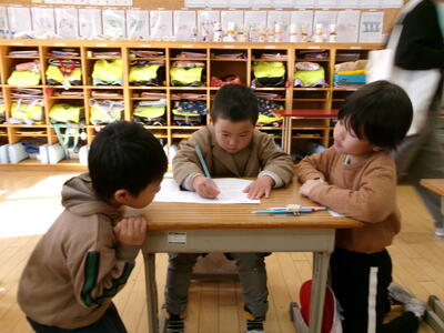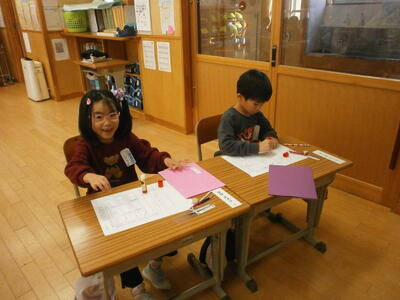 その後、先生が配った紙をハサミで切り始めた子どもたち。