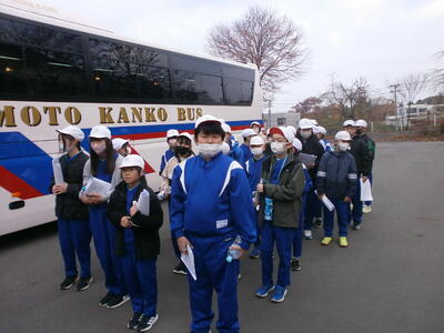 宿泊学習のはじめは、学校での出発式から。係児童が自分の言葉で進めていきます。バスに乗る前の子どもたちは、楽しみとちょっぴりの緊張が入り交じった面持ちです。